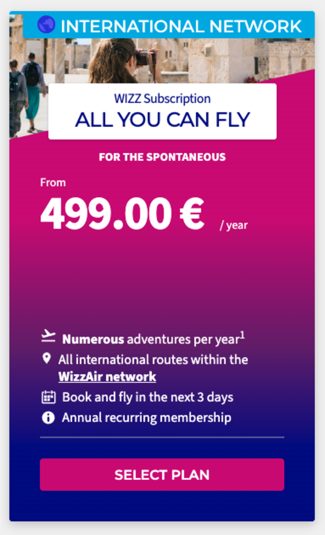 WIZZ All You Can Fly is een 12 maanden durend lidmaatschapsprogramma van Wizz Air Hungary Limited waarmee leden uitgebreid kunnen reizen met in aanmerking komende Wizz Air-vluchten. Zo werkt het: