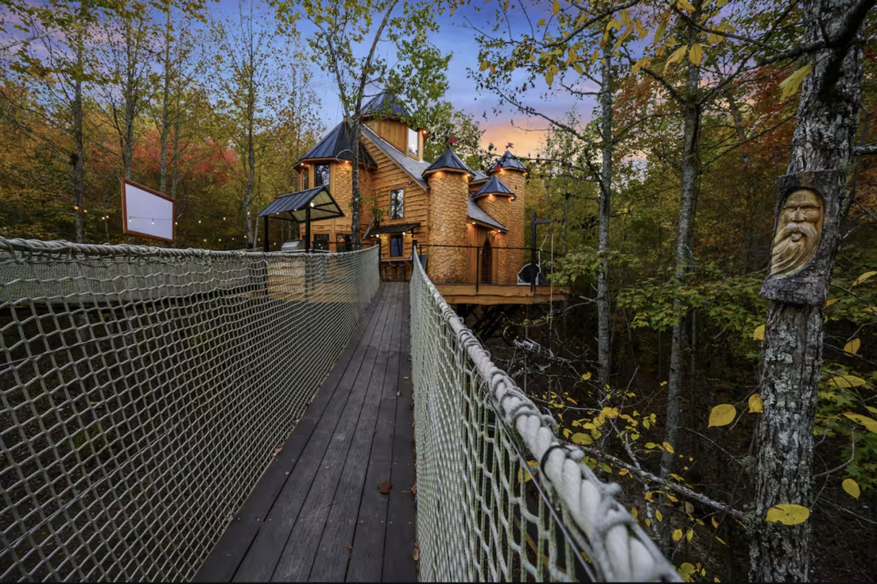 We hebben een buitengewone accommodatie gevonden! Deze waanzinnige boomhut ligt naast een waterval en heeft een openluchtbioscoop, een glijbaan, een jacuzzi, een sauna en nog veel meer!