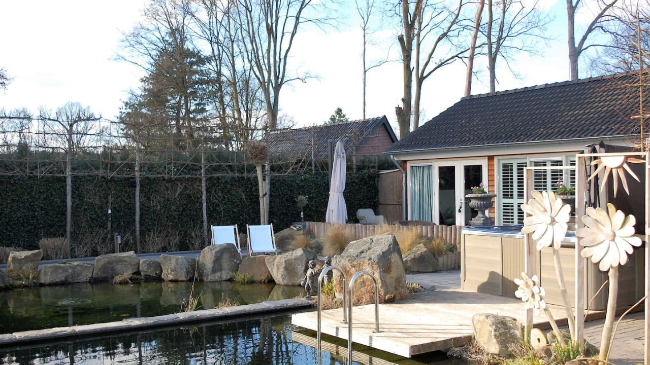 In de tuin kan je loungen op het terras, buiten lekker eten en bubbelen in de jacuzzi. Na de sauna dompel jezelf in je eigen zwemvijver!