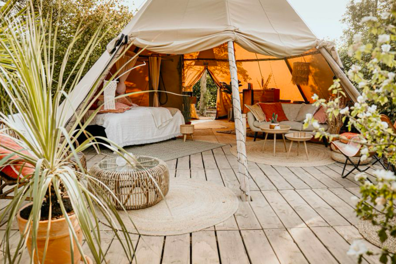 Je verblijft bij deze glamping in een prachtige tipi met een super trendy inrichting. Deze luxe tent beschikt over een tweepersoonsbed, een zithoek (zo willen we onze eigen woonkamer ook wel inrichten), een buitenterras, nespresso-apparaat, waterkoker, een koelkastje, een eigen badkamer en uiteraard gratis WiFi.