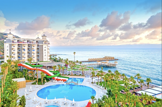Je verblijft bij Aria Resort 5* op zo'n 15 kilometer van Alanya centrum aan de Turkse Rivièra. Dit vijfsterrenhotel heeft een privéstrand voor de deur, een pier met ligbedjes, drie buitenzwembaden, een binnenzwembad en een hotelspa. Daarnaast kun je er een 24-uursreceptie, 1 buffetrestaurant, 1 à-la-carte restaurant en 5 bars vinden. Je maakt er uiteraard gratis gebruik van de WiFi en er is tevens parkeergelegenheid aanwezig. Je verblijft er op ultra all inclusive basis wat inhoudt dat ontbijt, lunch, diner, snacks, ijs en alcoholische en alcoholvrije drankjes bij je verblijf inbegrepen zitten.