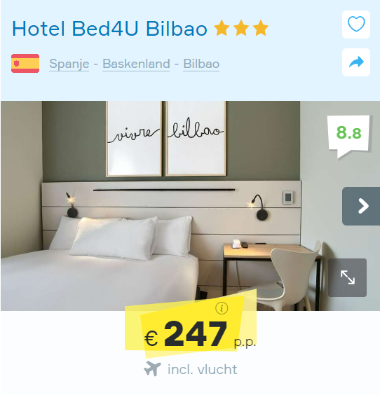 Met deze 4-daagse stedentrip deal van Vakantiediscounter ga jij al vanaf €253 p.p. naar Bilbao inclusief vluchten en verblijf. Hier verblijf jij in een hotel in het stadscentrum waardoor jij gemakkelijk met het openbaar vervoer of ter voet de stad kan ontdekken.