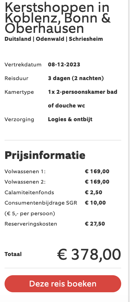 Prijs = €378 / 2 = €189 per persoon