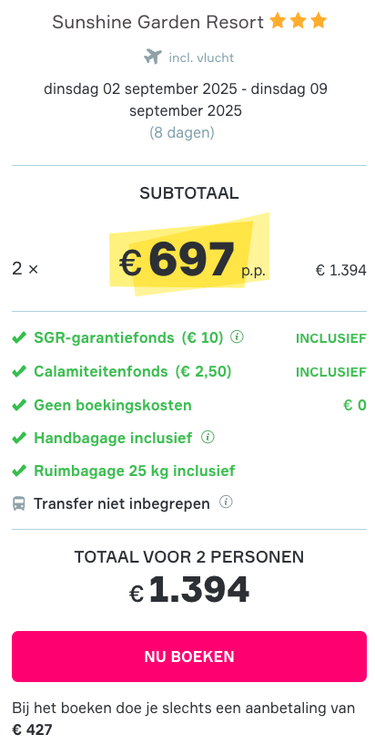 Voor deze prijs geniet je van een 17-daagse vakantie in Thailand. Het voordeligst ga je in september, maar deze vakantie is tot en met een jaar van tevoren te boeken via de Vakantiediscounter!