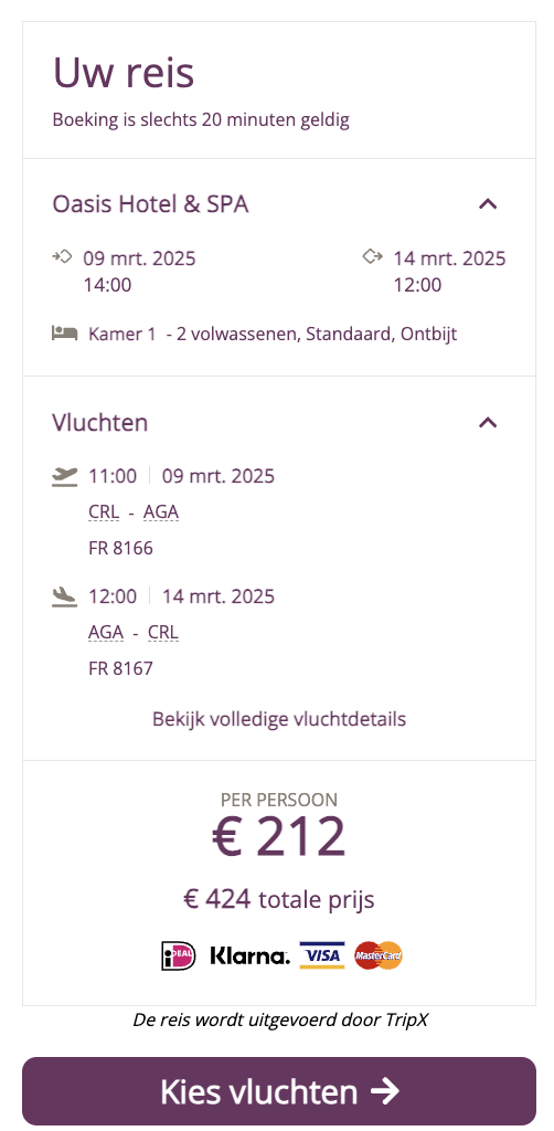 Liever op een ander moment naar Agadir? Bekijk dan hier de beschikbaarheid. Je boekt deze vakantie al t/m april 2025.