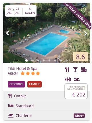 Wil jij dit jaar nog even lekker de zon opzoeken? Lees dan snel verder. Deze deal is echt iets voor jou! Met deze deal van TripX ga je dit jaar nog naar het zonnige Agadir, Marokko. Je boekt deze fijne 5-daagse vakantie met 4*-verblijf bij Hotel & Spa Tildi op loopafstand van het strand en Agadir centrum, ontbijt & vluchten al voor €202 p.p.