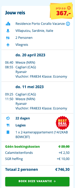 In ons prijsvoorbeeld vertrek je eind april. Wil je liever op een ander moment of minder lang naar Sardinië? Bekijk dan hier de beschikbaarheid. Je boekt deze heerlijke vakantie al t/m oktober 2023.