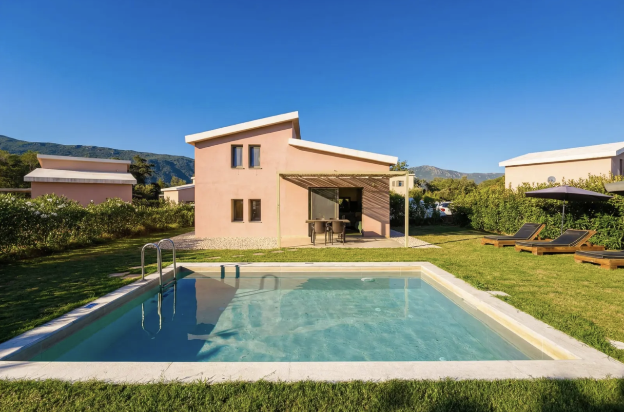 De moderne villa’s van ca. 75 m² zijn perfect voor families, vrienden, maar ook voor koppels en beschikken over twee slaapkamers, twee badkamers en een ruim terras. Natuurlijk ontbreekt het privézwembad met ligbedden niet. Begin je dag met een kopje koffie ☕️ in de zon en bereid een uitgebreid ontbijt 🍳 in de volledig uitgeruste keuken. Neem een verfrissende duik 💦 wanneer jij wilt en sluit de dag af met leuke spelletjes, een goed boek of gewoon een lekker drankje onder de sterren ✨.