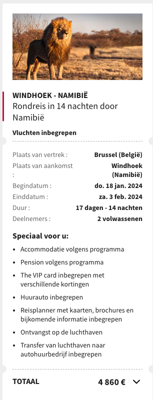 Je boekt jouw Namibië avontuur (17 dagen | 14 nachten) al voor €2480 p.p. en dit is inclusief vluchten, huurauto, roadbook, transfer naar het autoverhuurbedrijf, accommodaties en meerdere ontbijtjes. Check het zelf hier 😍