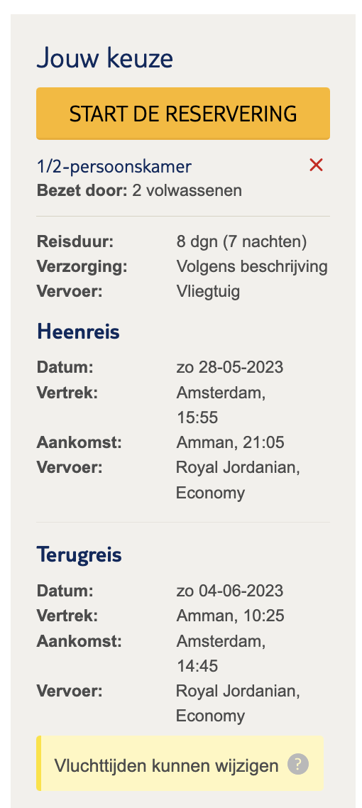Via TUI kan je een 8-daagse rondreis boeken naar Jordanië voor €1071. Dit is inclusief hotels met ontbijt, vluchten met ruimbagage en prachtige excursies. Zo ga je lekker drijven op de Dode Zee, maak je een jeepsafari in de woestijn (Wadi Rum) en ga je daar overnachten in een bedoeïenen tentenkamp dat je nooit meer zult vergeten.