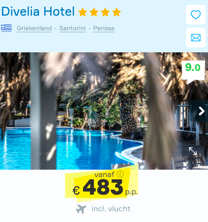 Tijdens deze vakantie verblijf je het 4*-Hotel Divelia, dat met een fantastische 9 is beoordeeld in de reviews. Dit kleinschalige boutique hotel beschikt slechts over 18 kamers, die voorzien van o.a. een telefoon, tv, gratis internet, airco, koelkastje balkon of terras en badkamer met bad of douche en toilet. De gezellige badplaats Perissa is nabij en ligt op slechts enkele minuten lopen van het zwarte lavastrand. Hier zijn ligbedden en parasols te huur. Aan de rand van het zwembad vind je daarnaast leuke tavernes en barretjes. Elke ochtend begin je je dag met een lekker ontbijtje. Laat de vakantie maar beginnen!