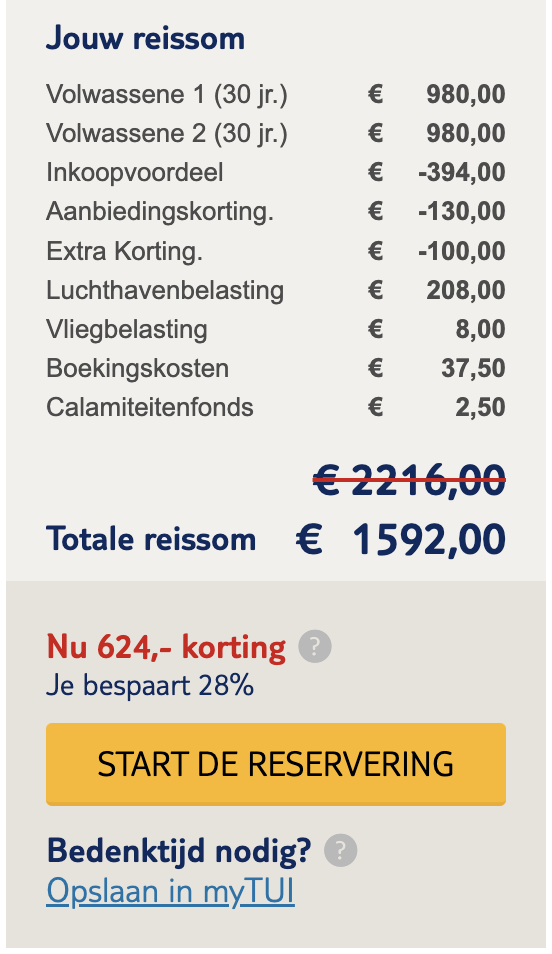 €1592 / 2 personen = €796 per persoon. Ook zijn de Facility Fee voor gebruik van wifi, fitness en telefoon en de 14,75% belasting & $3,50 toeristenbelasting per nacht al inbegrepen bij dit bedrag.